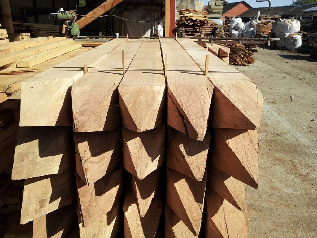 Vierkant bezaagd, rond ontschorst en/of rond gekloofd.